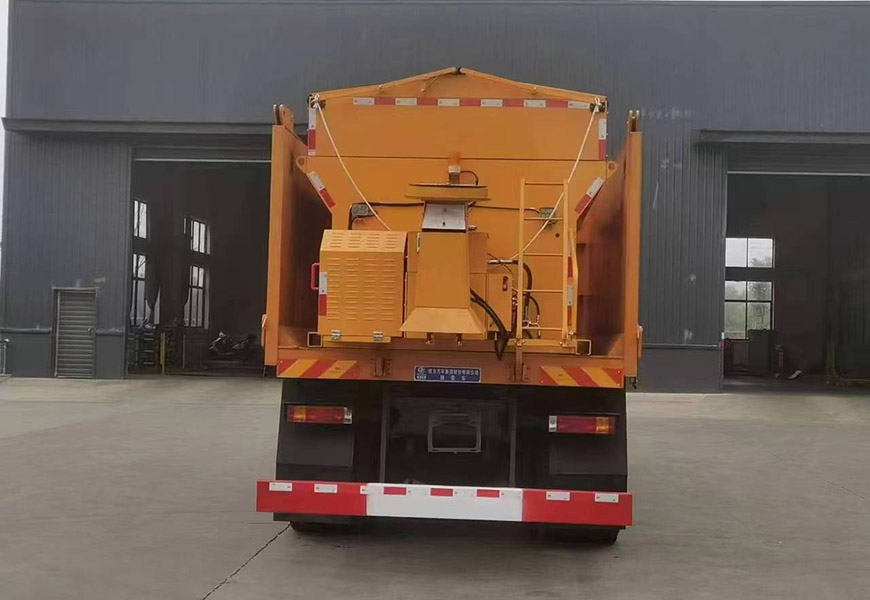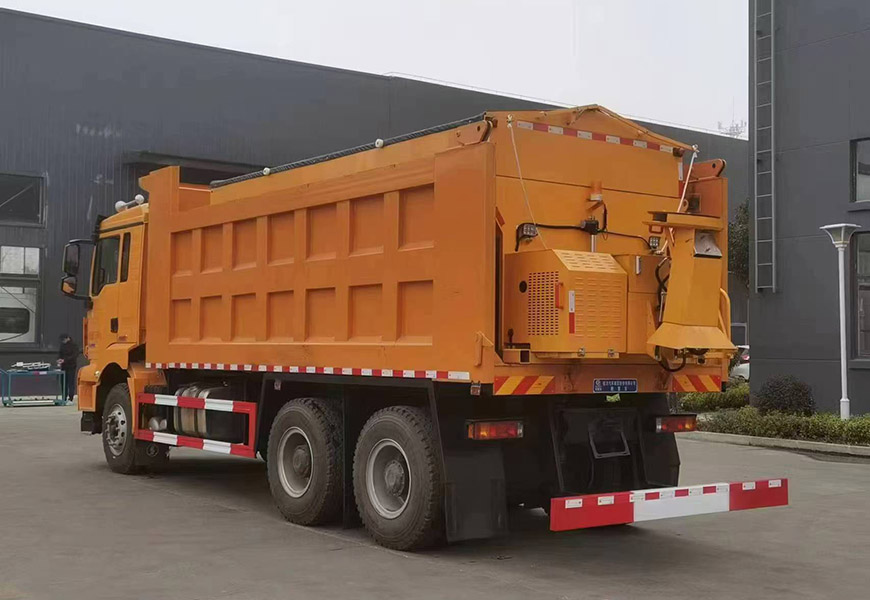 上裝配置 箱體采用優(yōu)質(zhì)碳鋼板,標配10立方撒布機也可以選裝12立方,不銹鋼撒布機甩盤,撒布盤直徑550mm,撒布機采用 V 型料倉,結(jié)構(gòu)簡單可靠,使融雪劑自動落料,出料完全,無殘留,箭頭燈、篷布、過濾網(wǎng)、后爬梯。加裝3.5米雪鏟,可切換3.5米除雪滾刷(滾刷可選自帶動力或者液壓取力)。