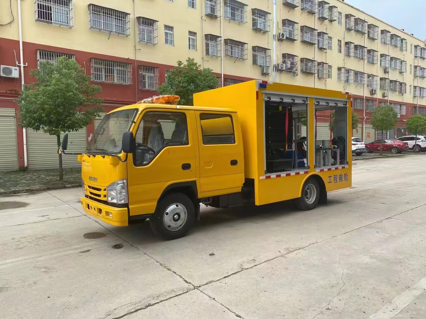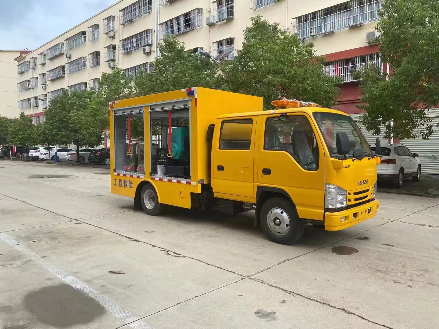 | 上裝配置 | 車箱一體式全封閉車箱車箱有隔音功能,廂體防火,阻燃,防雨,防塵,防銹,降噪,隔震,長期抗震結構,廂體外觀按照公告外觀制作,左右卷簾門,尾部是卷簾門,廂內(nèi)安裝LED作業(yè)燈,作業(yè)燈帶獨立開關,底板采用花紋板。配備康明斯50KW發(fā)電機組,2臺功率22KW便攜式超輕型高速潛水泵,單臺水泵流量可達500m³/h,單泵配40米排水管(20米/根),水管直徑 DN200mm,水管材質為滌綸長絲編織。配有升降照明燈,升降燈可通過無線和有線遙控兩種方式控制,升降燈升降高度為1.2米,可水平旋轉。帶接地樁和接地電纜線,便攜泵控制柜,潛水泵浮圈,長排警燈,倒車影像,配兩只手提式干粉滅火器2只。其余為標配… | ||