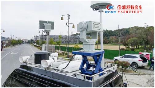 頂部:雷達(dá)偵測(cè)設(shè)備,電子干擾及無(wú)人機(jī)誘騙一體,無(wú)線電檢測(cè)設(shè)備,光電跟蹤設(shè)備
