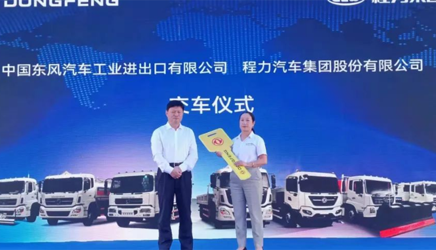 隨后,中國東風(fēng)汽車工業(yè)進(jìn)出口有限公司商用車海外營銷部中重型產(chǎn)品總監(jiān)吳永剛與程力集團(tuán)國際市場部業(yè)務(wù)經(jīng)理陳葦舉行了交車鎖匙牌授牌儀式。
